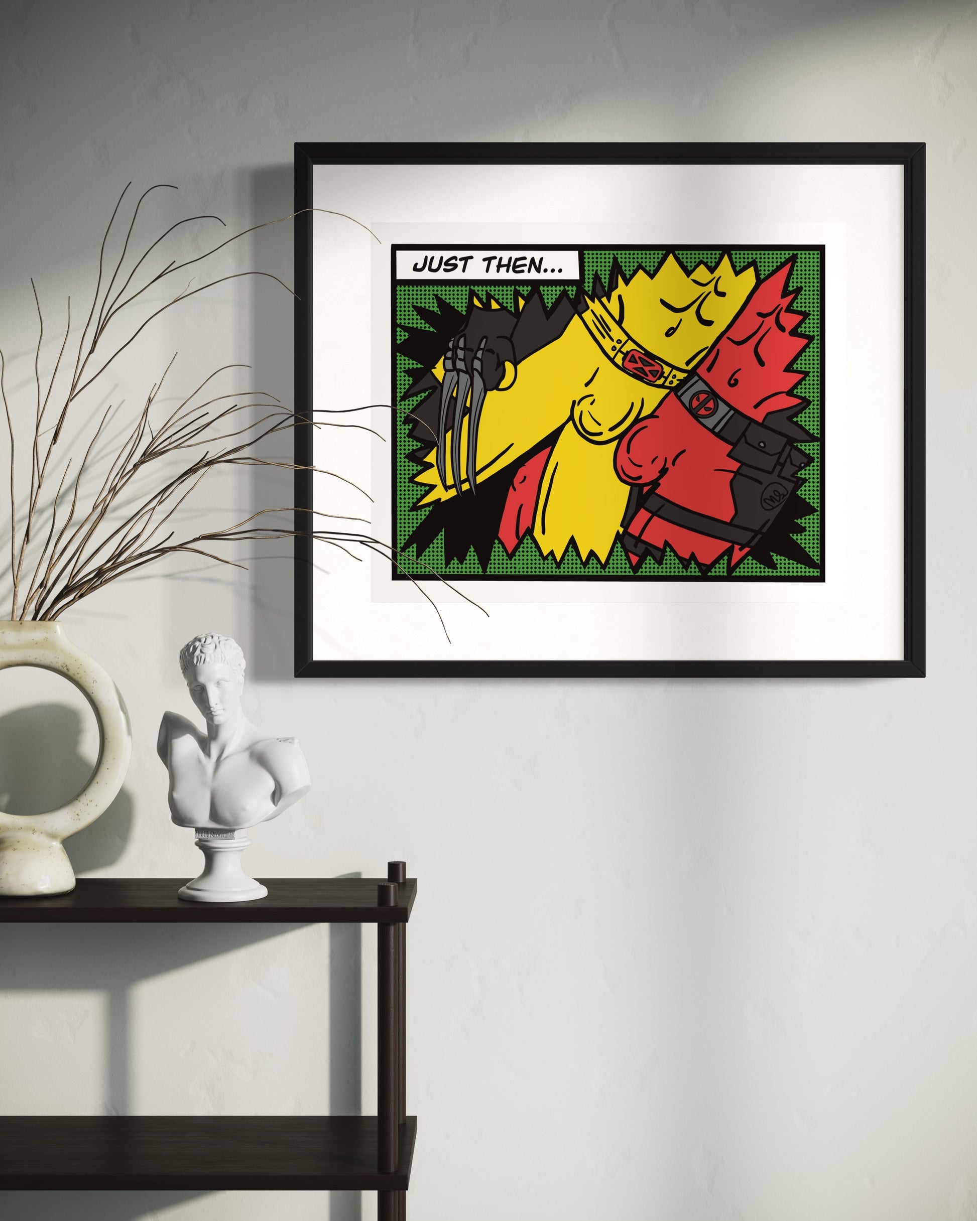 “Just then” is a dynamic comic scene featuring two iconic superheroes in a bold, vibrant style reminiscent of classic comic books. With striking yellow and red costumes, dramatic black outlines, and a captivating background, the piece captures the intensity and energy of their intimate embrace.