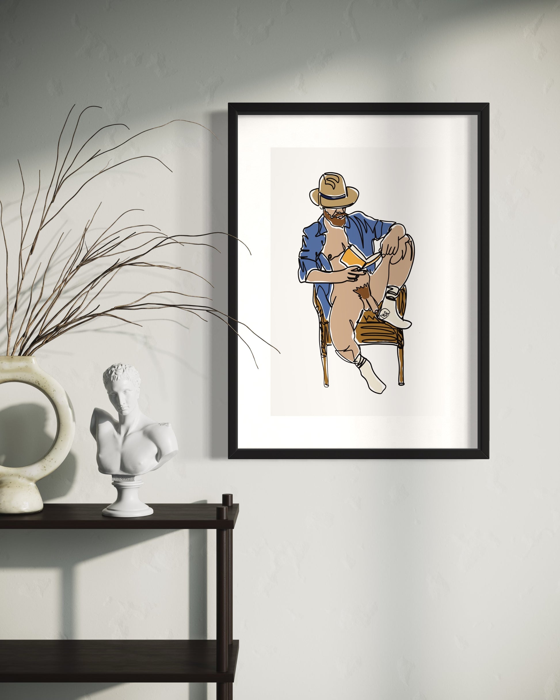 "The Reader" is a captivating line drawing that exudes a sense of relaxed contemplation. The artwork features a bearded man, casually seated in a wicker chair, engrossed in a book. His attire—a wide-brimmed hat, an open blue shirt, and white socks—suggests a blend of rustic charm and modern nonchalance. The minimalist lines and selective use of color emphasize the subject's serene demeanor and the intimate moment of reading. The hat partially obscures his face, symbolizing introspection and the personal journey one embarks upon through literature. This piece beautifully captures the essence of solitude and the timeless pleasure of getting lost in a good book.