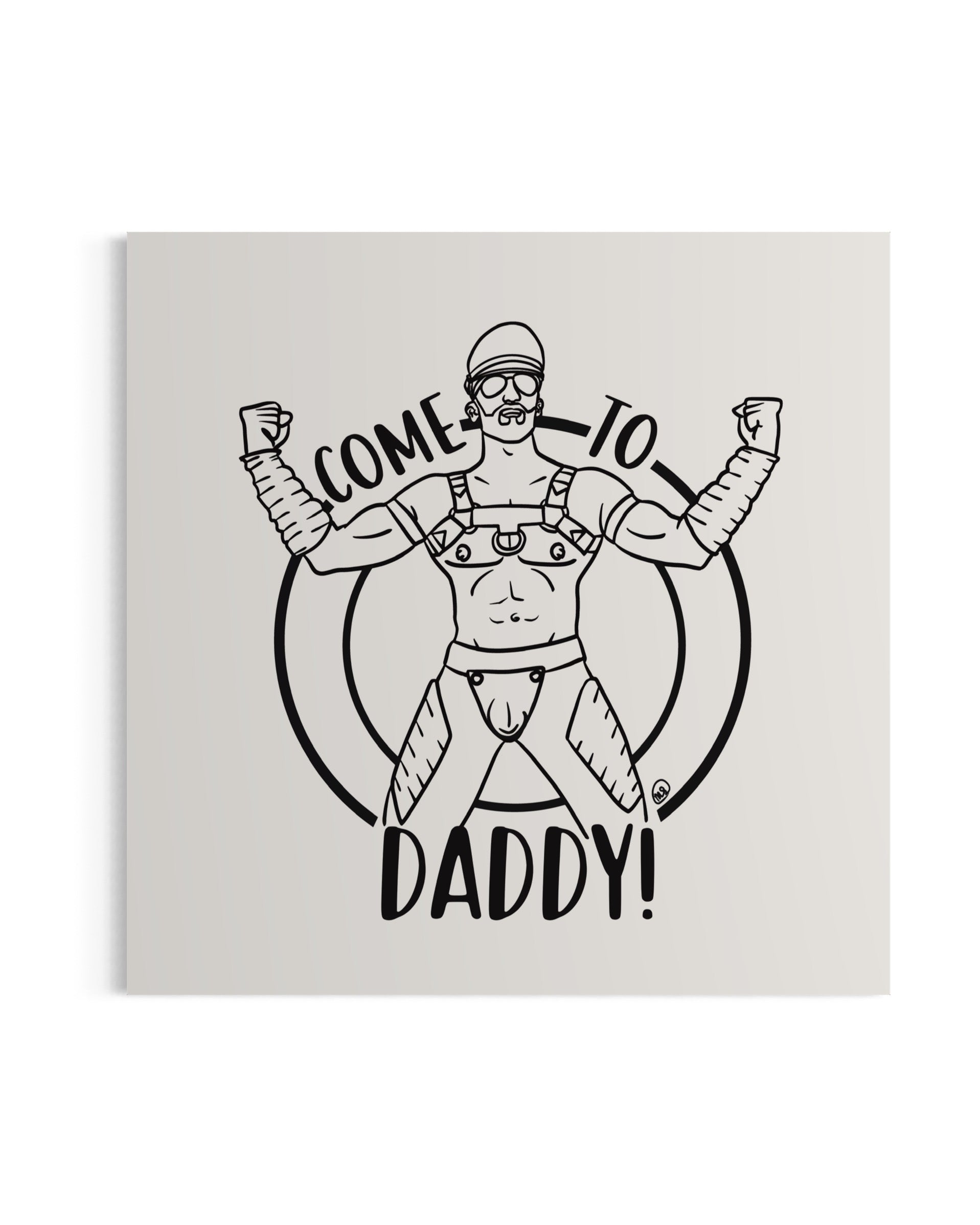 "Come to Daddy" is a bold black-and-white illustration featuring a muscular figure in leather gear, flexing confidently. The exaggerated style and commanding pose explore themes of power, dominance, and parody, inviting viewers to engage with its provocative and humorous nature.