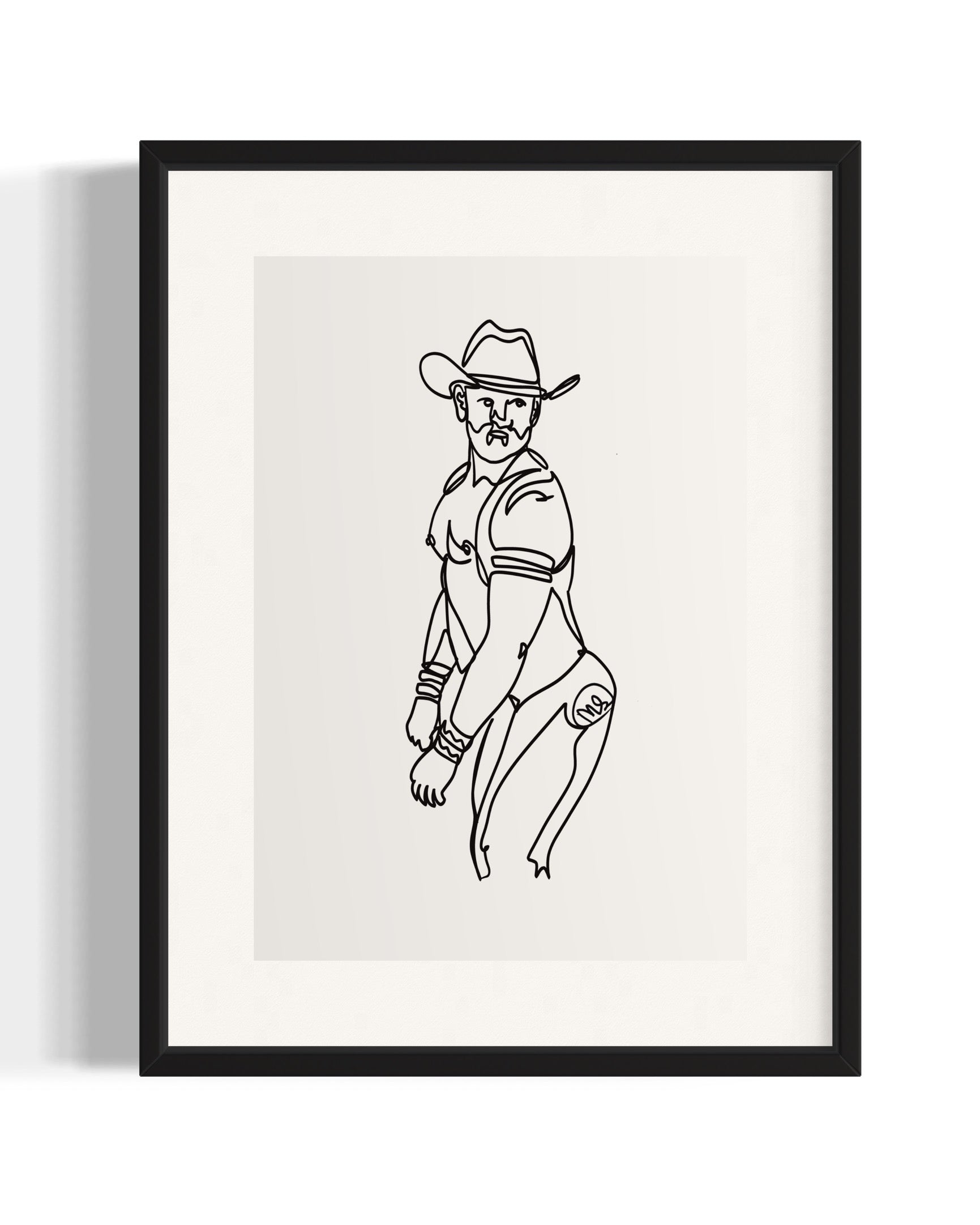 Giddy up, kinksters! This "Leather Cowboy" sketch lassoes the wild side of Western wear. A cheeky cowpoke struts his stuff in fetish finery - a daring vest hugs his torso, while his derrière says howdy through chaps. Topped with a sassy Stetson, this buckaroo's ready to ride into risqué adventures. It's a rodeo of risqué, where every line hints at leather-clad mischief!