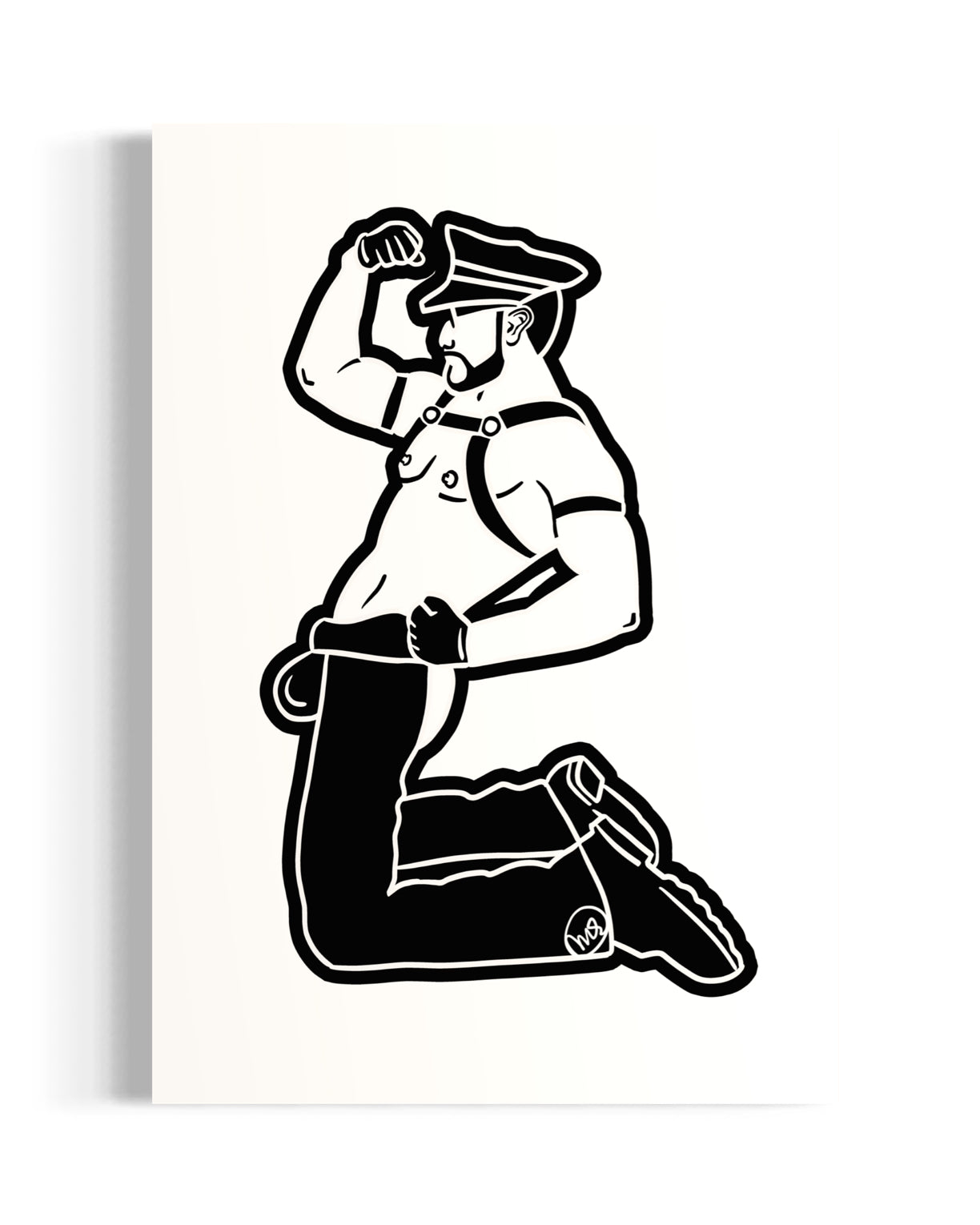 "Leather Daddy Bulge" is a striking piece that captures the essence of bold masculinity and fetish culture. Rendered in a minimalist black and white palette, the artwork features a stylized figure in a leather harness and cap, exuding strength and confidence. The exaggerated lines and prominent bulge emphasize themes of power and sexuality, challenging societal norms and celebrating the freedom of self-expression. This provocative illustration invites viewers to explore the intersections of identity, desire, and empowerment within the leather subculture.