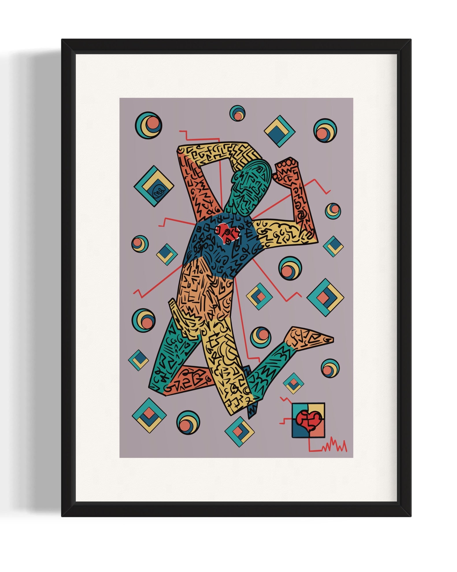 "Love’s Puzzle" is a vibrant, modern, and geometric artwork featuring a human figure intricately composed of patterns and symbols. The dynamic shapes and bold colors reflect the complexity and multifaceted nature of love. The heart symbol centralizes the theme of connection and emotion, embodying love's intricate puzzle.