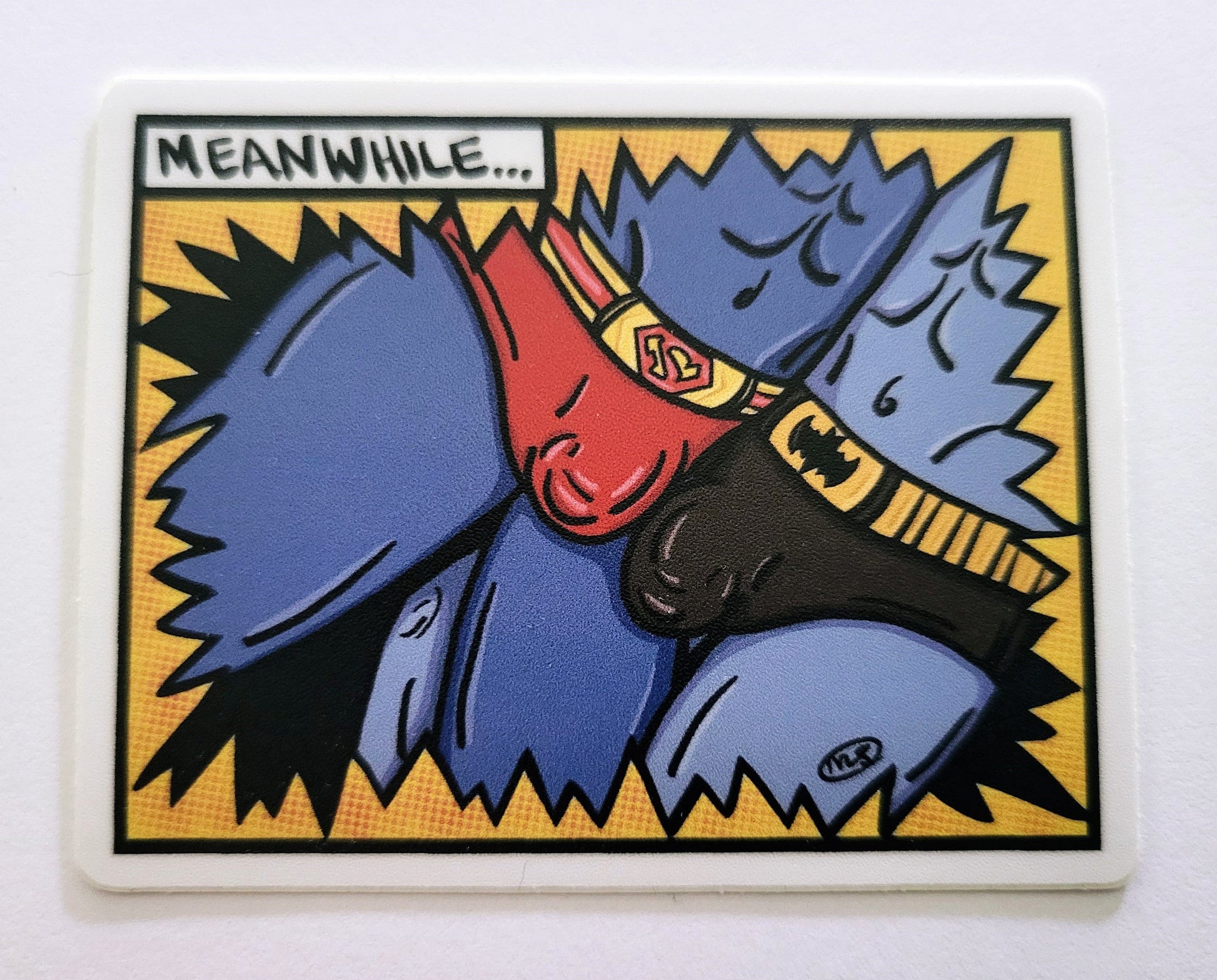 This comic-style artwork, titled "Meanwhile...", features a playful and imaginative mashup of iconic superhero elements. The piece showcases a close-up of Superman and Batman, but with a twist. Rendered in a bold, pop art style with a dotted yellow background, the illustration captures the dynamic energy of classic comic books. The unexpected combination of Superman and Batman's symbols creates a visual metaphor for the merging of their identities, inviting viewers to ponder the story behind this intriguing scenario.
