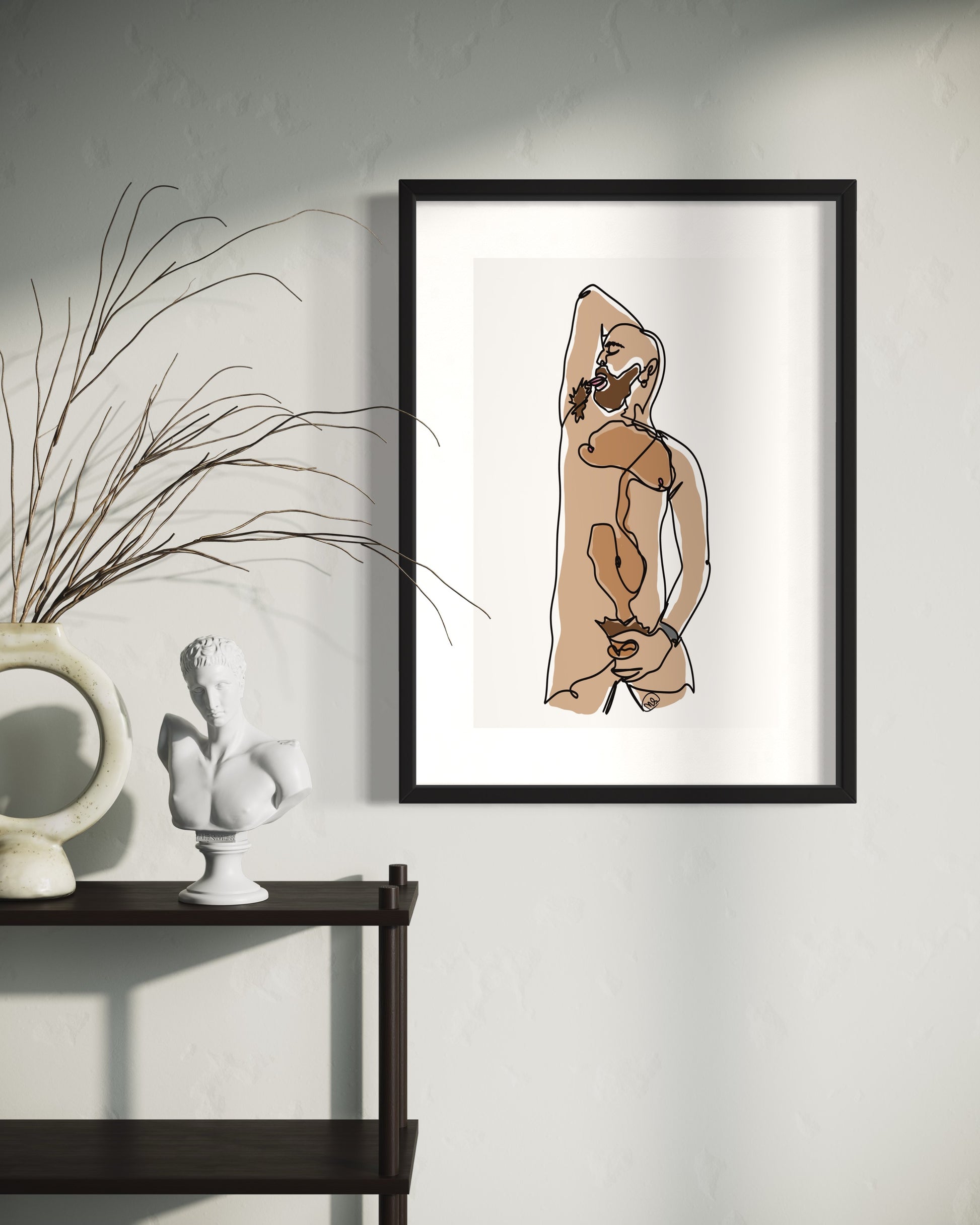 "Pit Lick" is a striking line drawing that captures the raw essence of human sensuality and self-exploration. The minimalist style, characterized by bold, continuous lines, emphasizes the contours and form of the human body, creating a sense of fluidity and movement. The figure, depicted in a provocative pose with an arm raised and a tongue extended towards the armpit, evokes themes of self-indulgence and intimacy. The use of earthy tones adds warmth and depth, while the abstract representation of the nude body suggests a deeper connection between physical desire and inner self-awareness. This piece challenges conventional notions of eroticism, inviting viewers to explore the boundaries of personal and bodily expression.